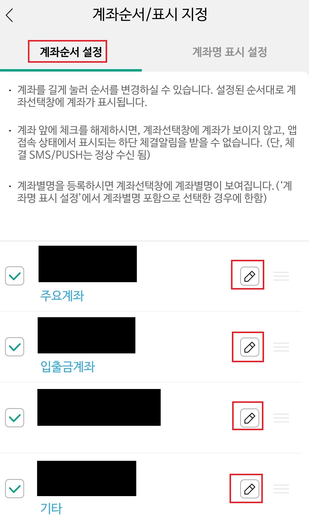 "계좌순서 지정"에서 위의 그림과 같이 빨간색 박스로 표시된 "연필모양 아이콘"을 눌러줍니다.
