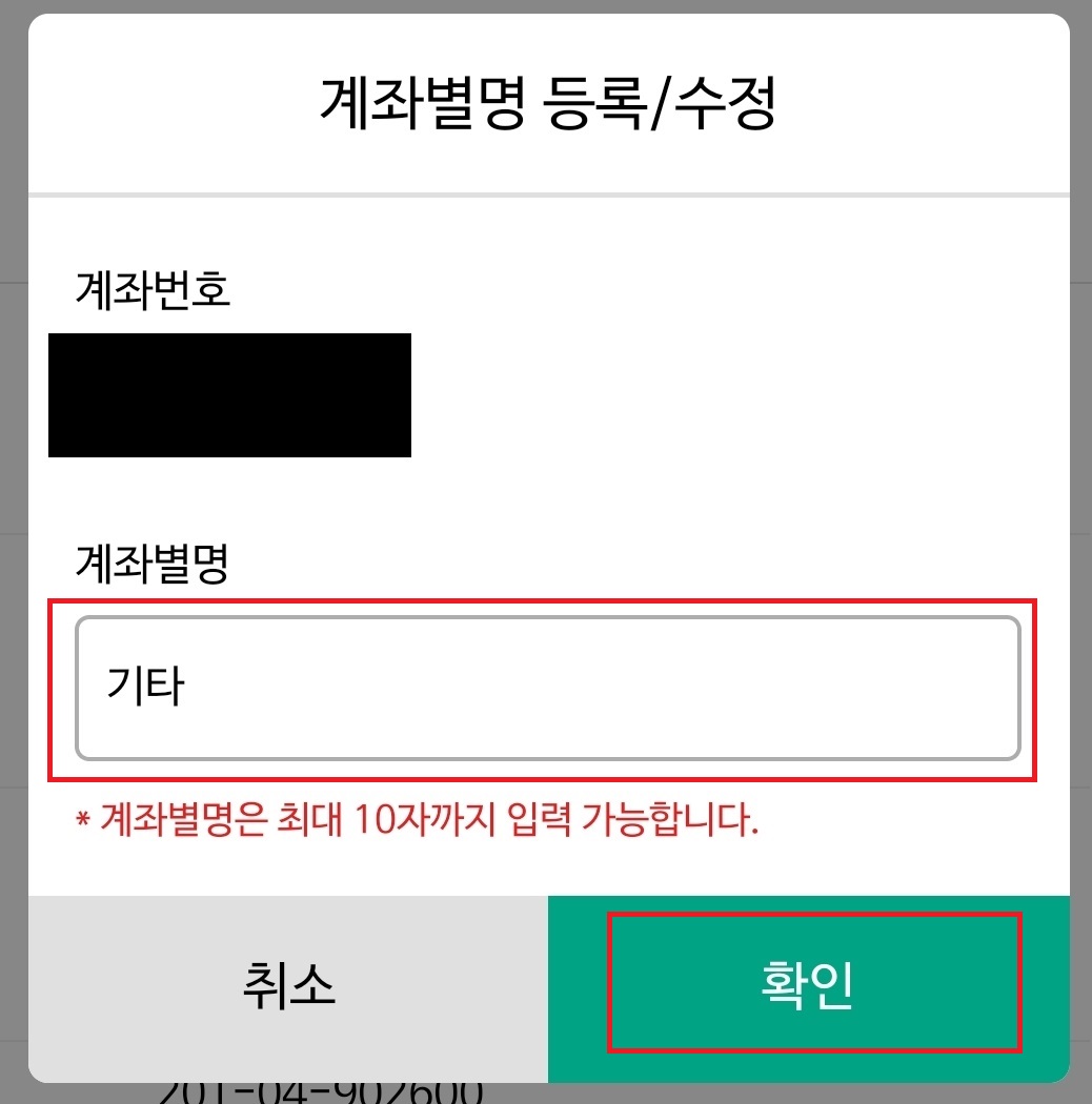 원하시는 계좌에 계좌별명을 입력하시고 "확인"을 눌러 주시면 됩니다.