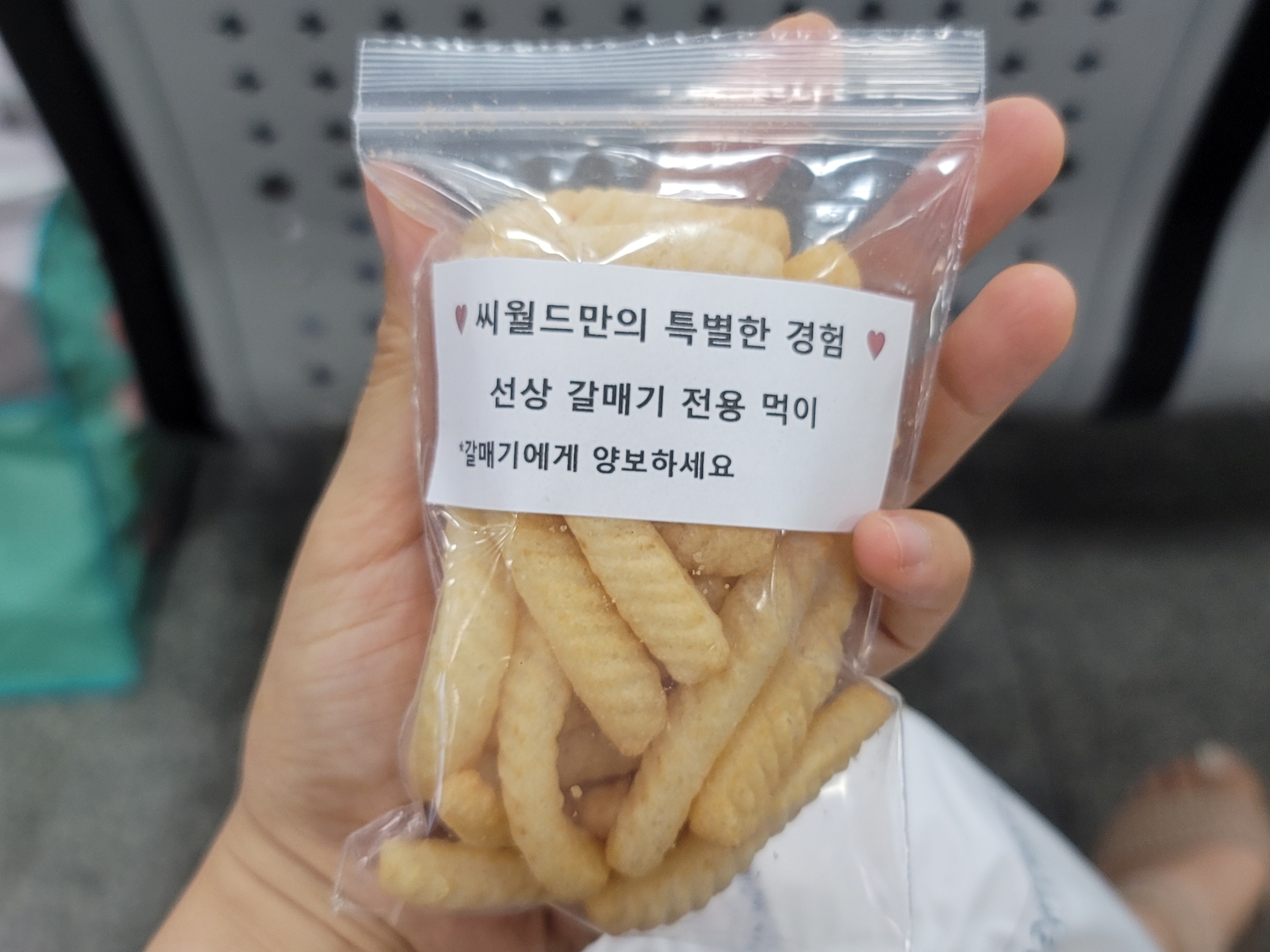 선상에서 갈매기에게 먹이 주라고 새우깡도 주네요.