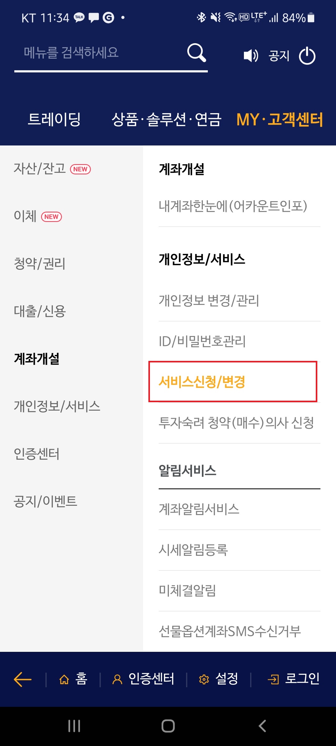 3. "MY.고객센터" 메뉴로 들어가서 "서비스신청/변경"을 눌러줍니다.