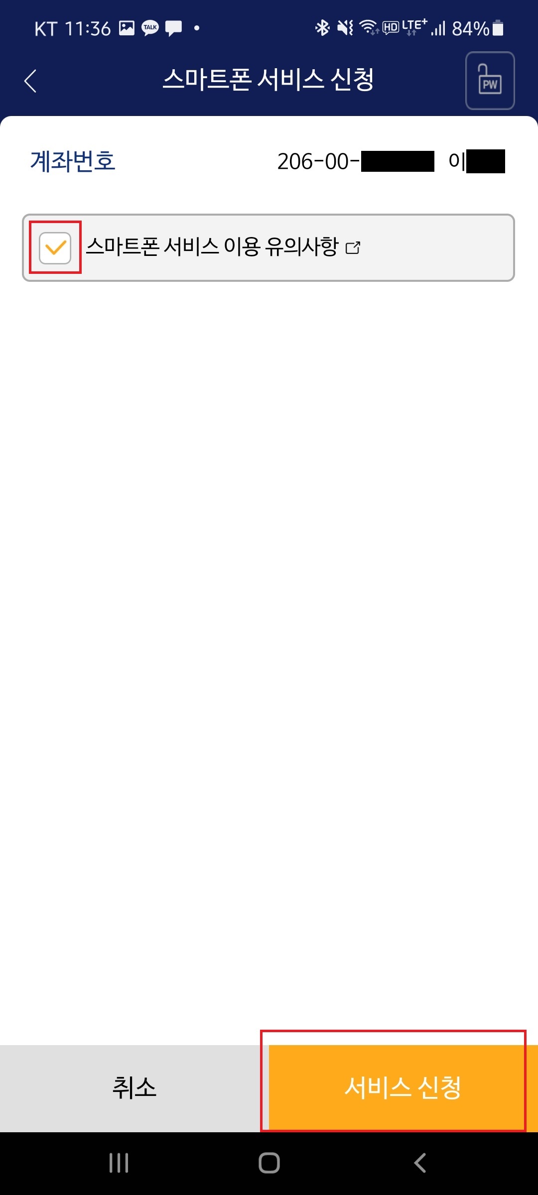 8. "스마트폰 서비스 이용 유의사항"을 체크하시고 맨 아래에 "서비스 신청" 버튼을 눌러줍니다.
