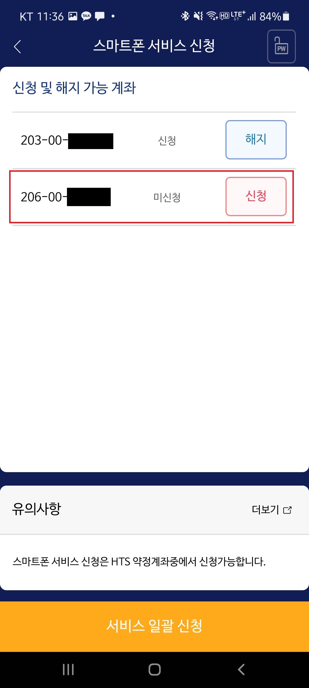 7. "신청 및 해지 가능 계좌"에서 아래 그림과 같이 "신청" 버튼이 활성화 된 부분을 눌러줍니다.