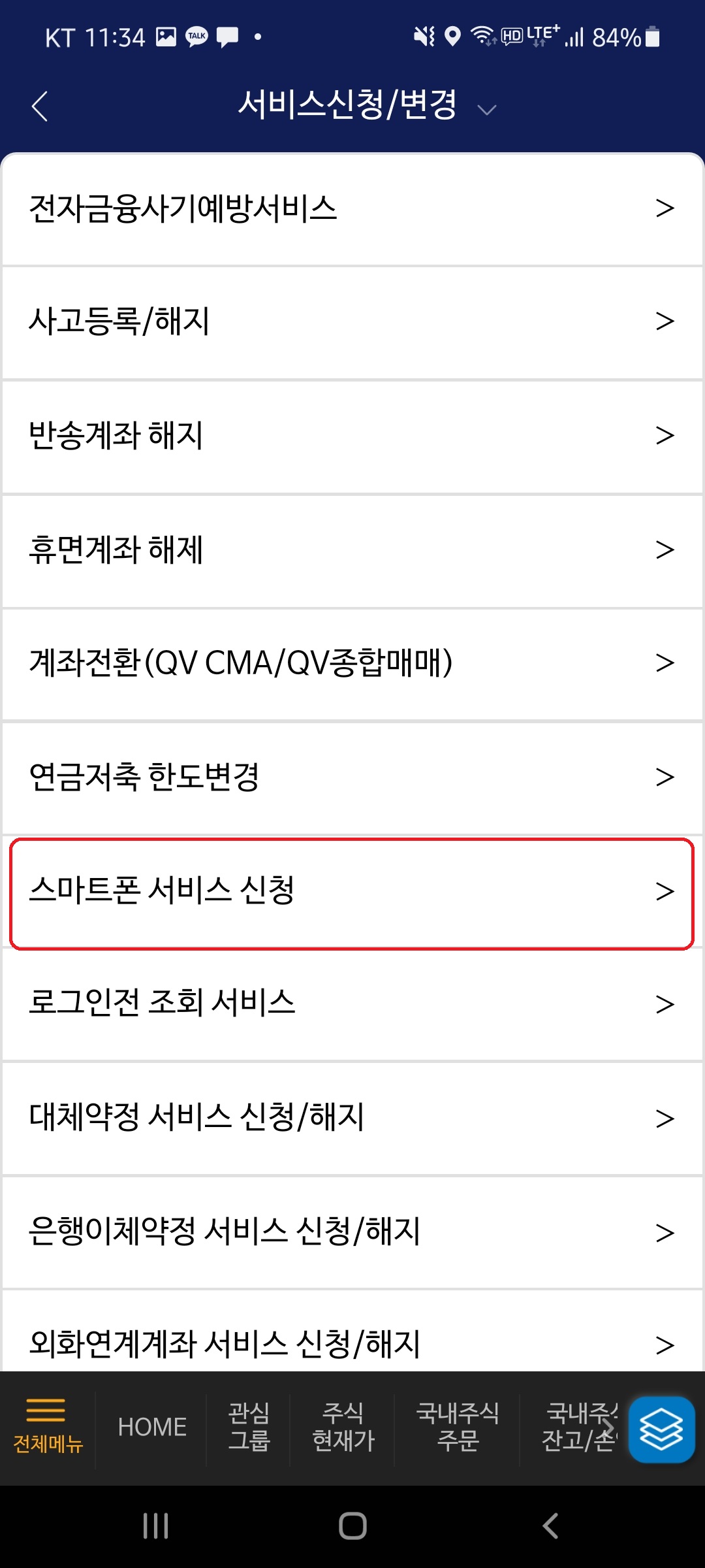 6. 다시 "서비스 신청/변경" 메뉴에서 "스마트폰 서비스 신청" 메뉴로 들어갑니다.