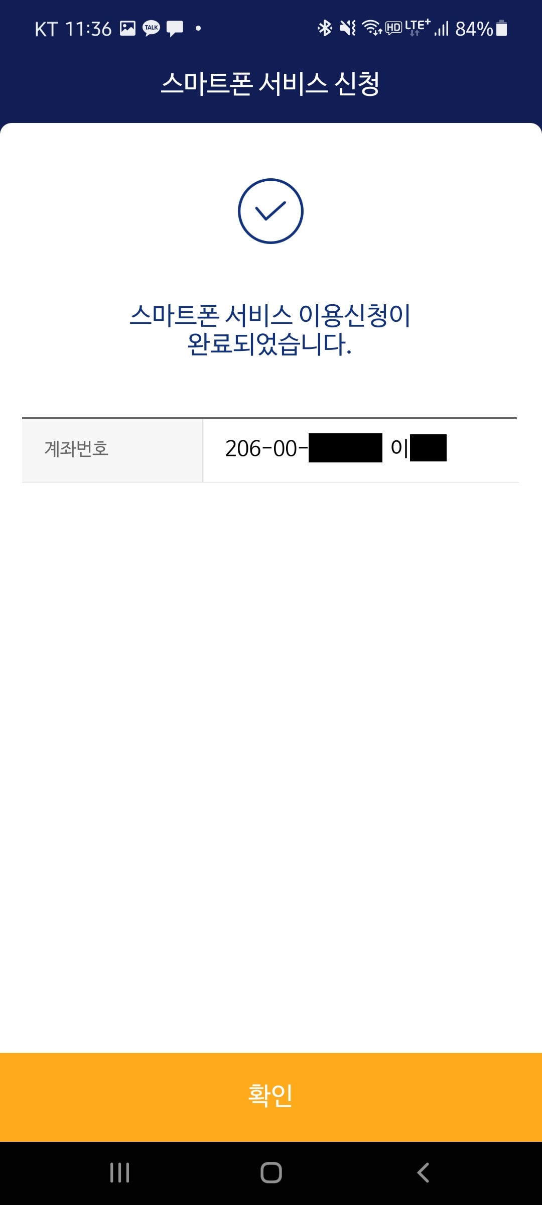 9. "스마트폰 서비스 신청" 화면에서 완료가 되었으면, 아래에 "확인" 버튼을 눌러줍니다.