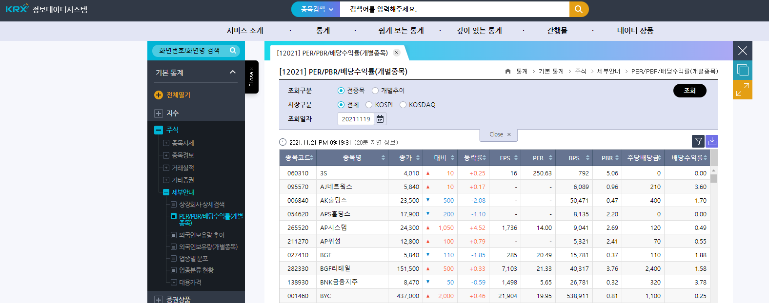 KRX에서는 모든 상장된 종목의 PER, PBR, 배당수익률 등의 자료를 날짜별로 제공합니다.