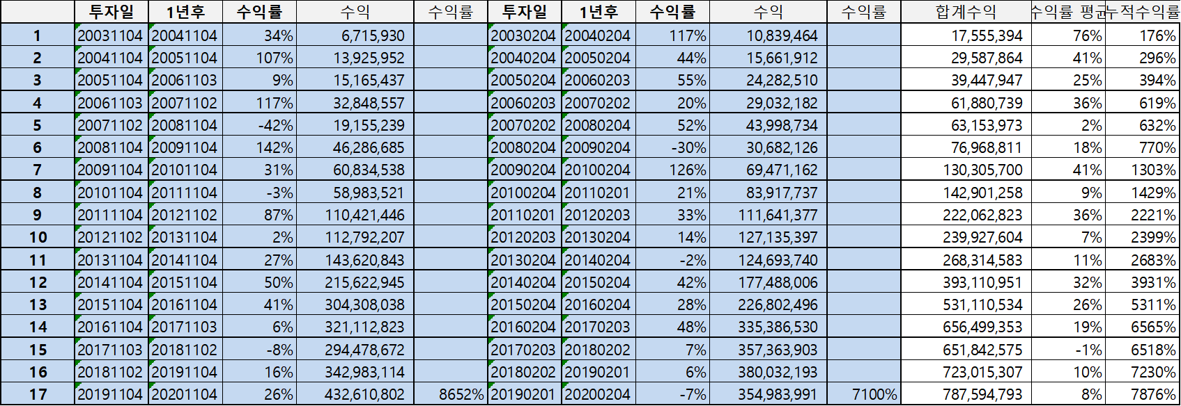 2003년부터 매월 11월 4일 즈음에 매수를 하고, 1년 후 매도 후 다시 매수하는 방법으로 17년간 백테스틀 해 보았다.