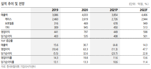 매출은 2020년 미국에서 손세정제가 일회성 매출로 나와서 2020년 대비 2021년 매출이 감소 된 것으로 보인다. 대부분의 사람들은 관심이 없겠지만, 슈피겐코리아는 손세정제가 주력이 아니다. 스마트폰 케이스가 주력이다. 스마트폰 케이스가 70% 정도의 매출을 담당하고, 보호필름이나 엑세서리가 나머지 30% 정도를 차지한다.