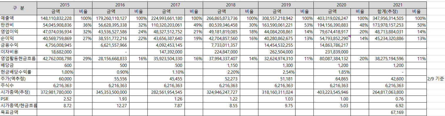 2015년부터 재무제표를 근간으로 2021년치를 추정해 보았다. 매출을 보수적으로 잡아서 PSR이 0.76이 예상되었다. 사실 0.76도 이전 해와 비교하면 상당히 낮은 값이다. 확실히 저평가라는 생각이 들었다.