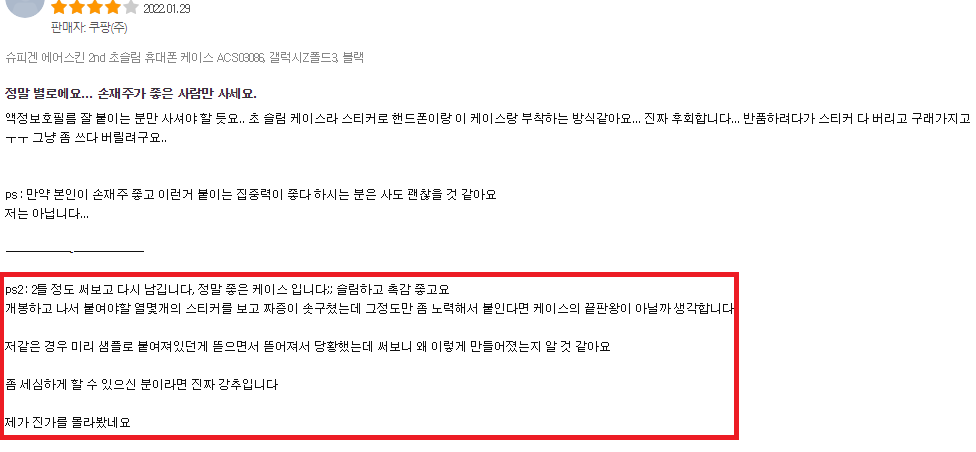 상품평을 읽다보니 처음에 별로라고 했다가 몇 일 쓰고 다시 좋다고 얘기한 사람도 있다. 나 같으면 귀찮아서 다시 상품평을 재작성 하는 일을 안 할건데, 정말 만족을 했는지 다시 후기를 쓸 정도면 퀄리티가 구매자의 마음을 움직였다고 볼 수 있다.
