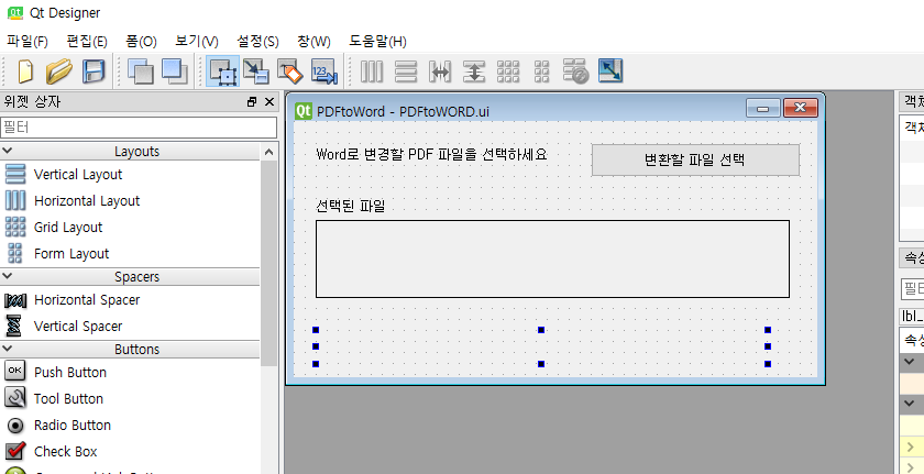 QtDesigner를 이용해서 아래와 같이 UI 레이아웃을 구성해 보았습니다.