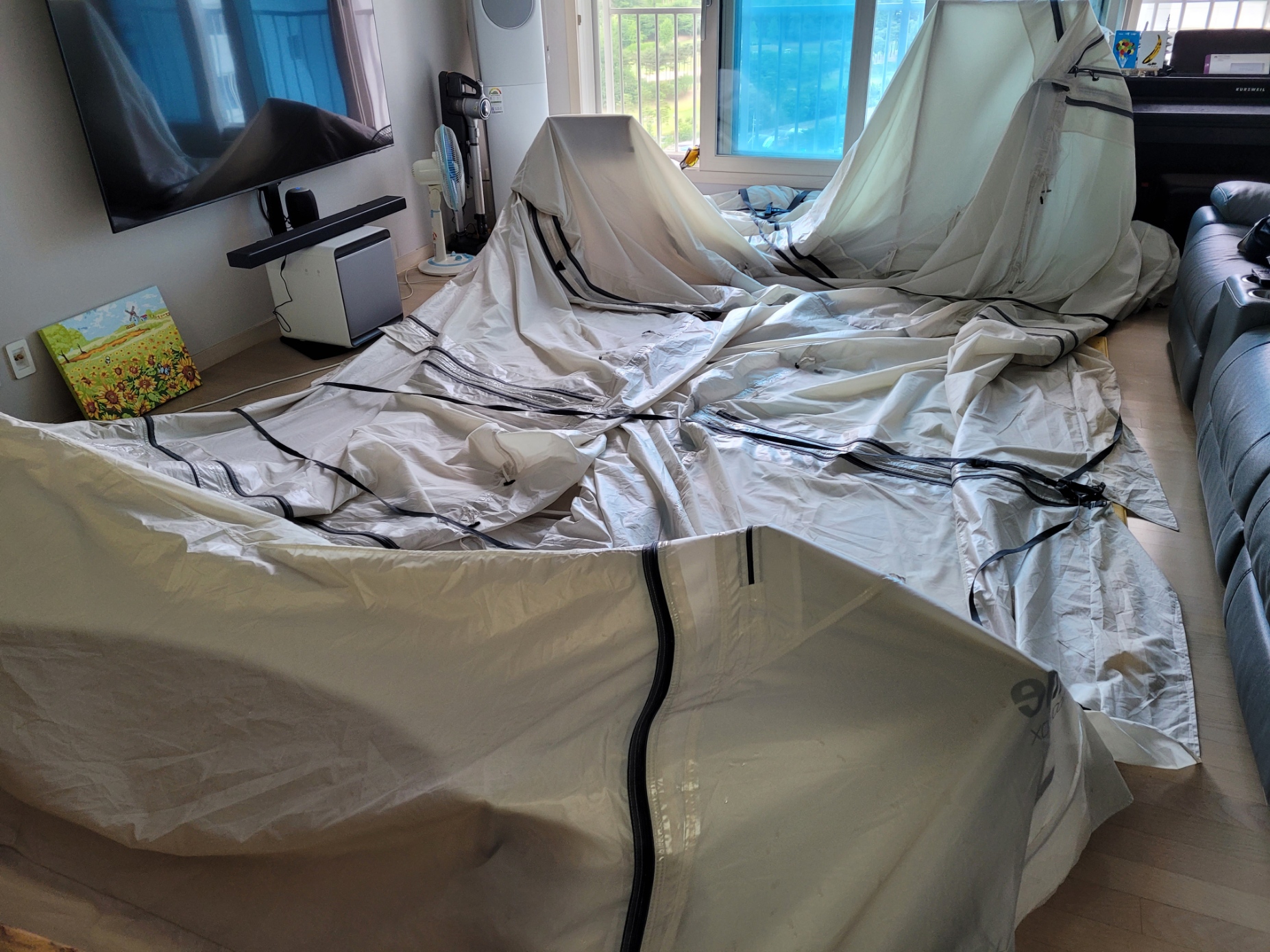 집에와서 텐트를 거실에서 말리고, 젖은 폴대와 팩도 수건으로 닦았다.