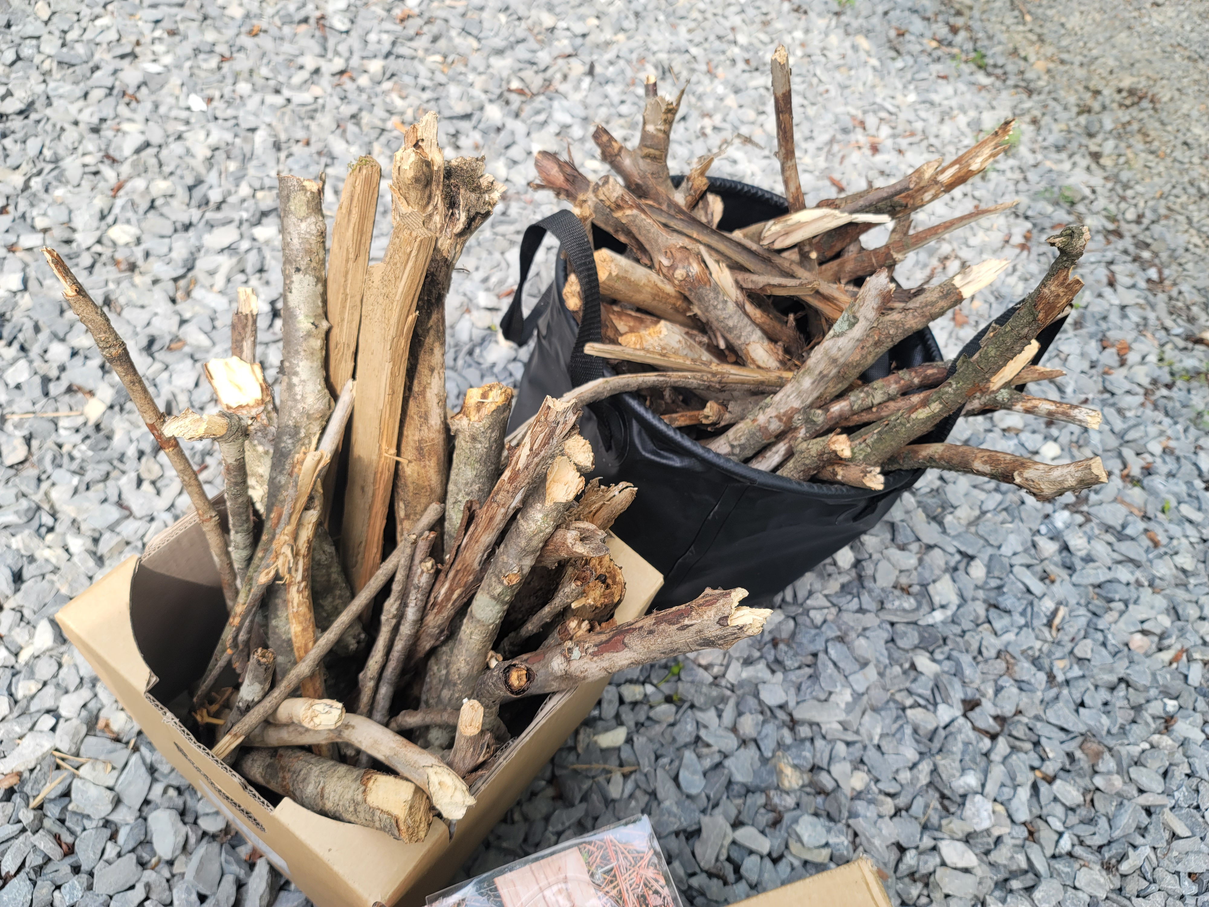 장작을 20kg나 사서 왔는데, 주변에 죽은 나무가지를 주워왔다.