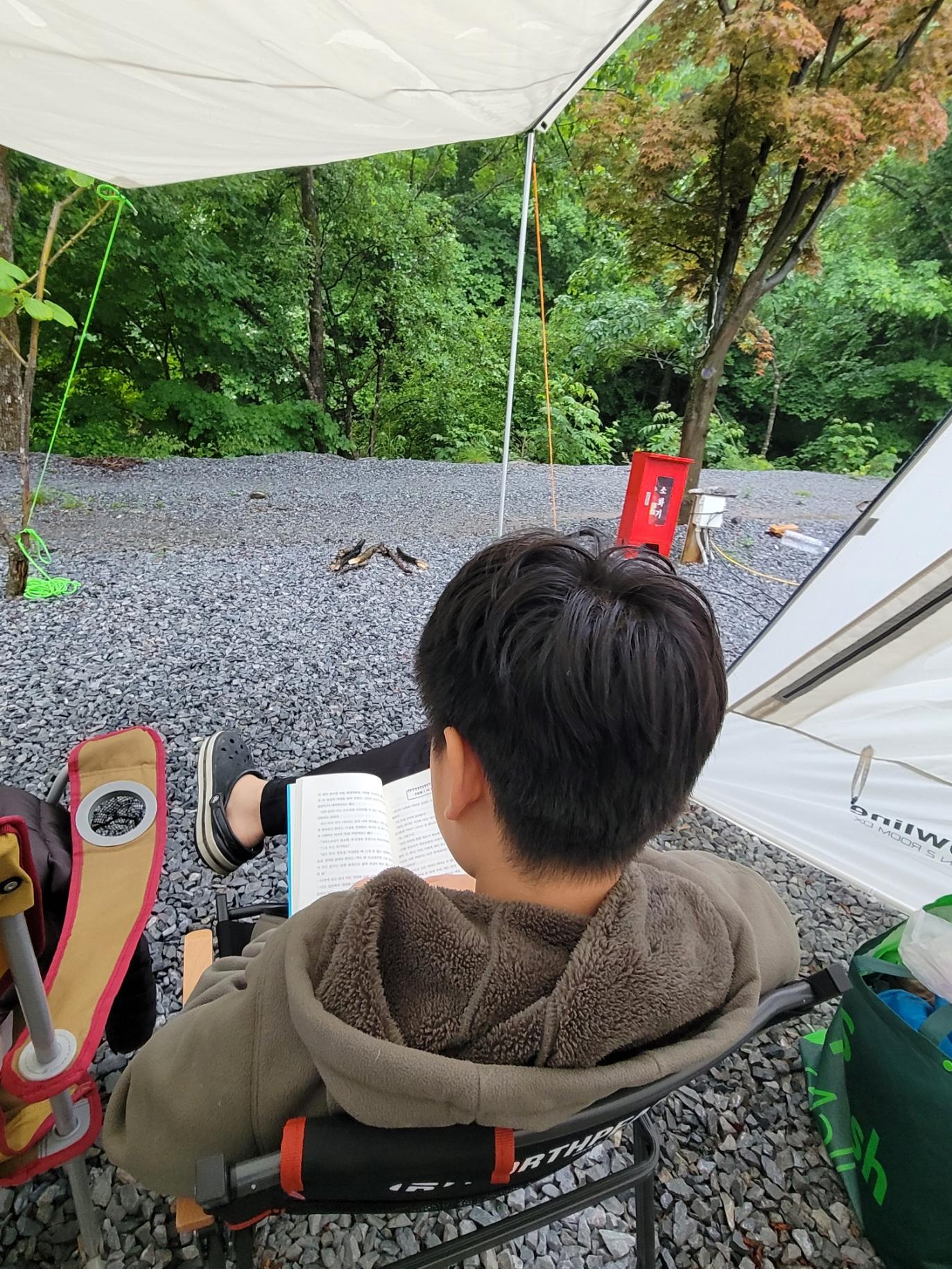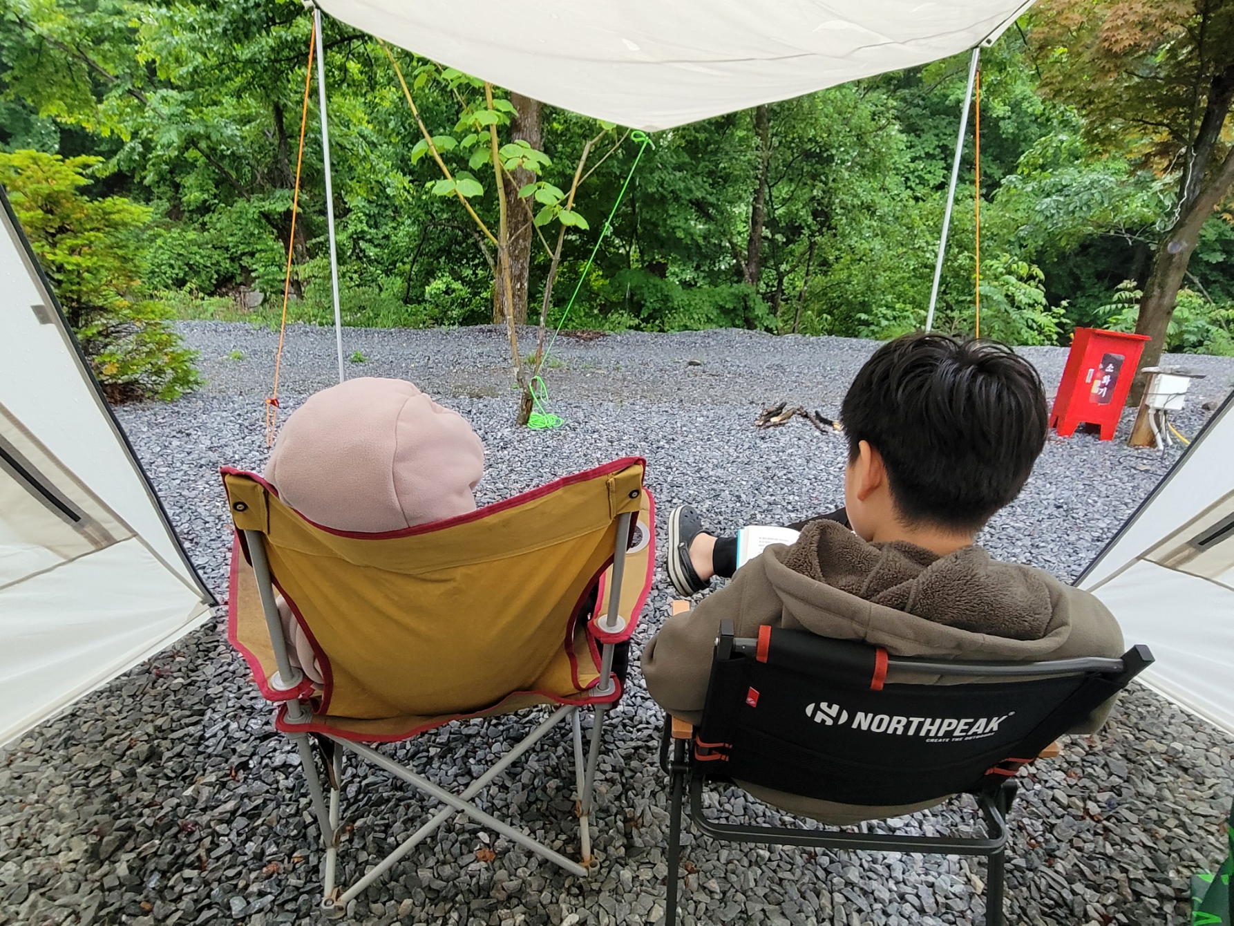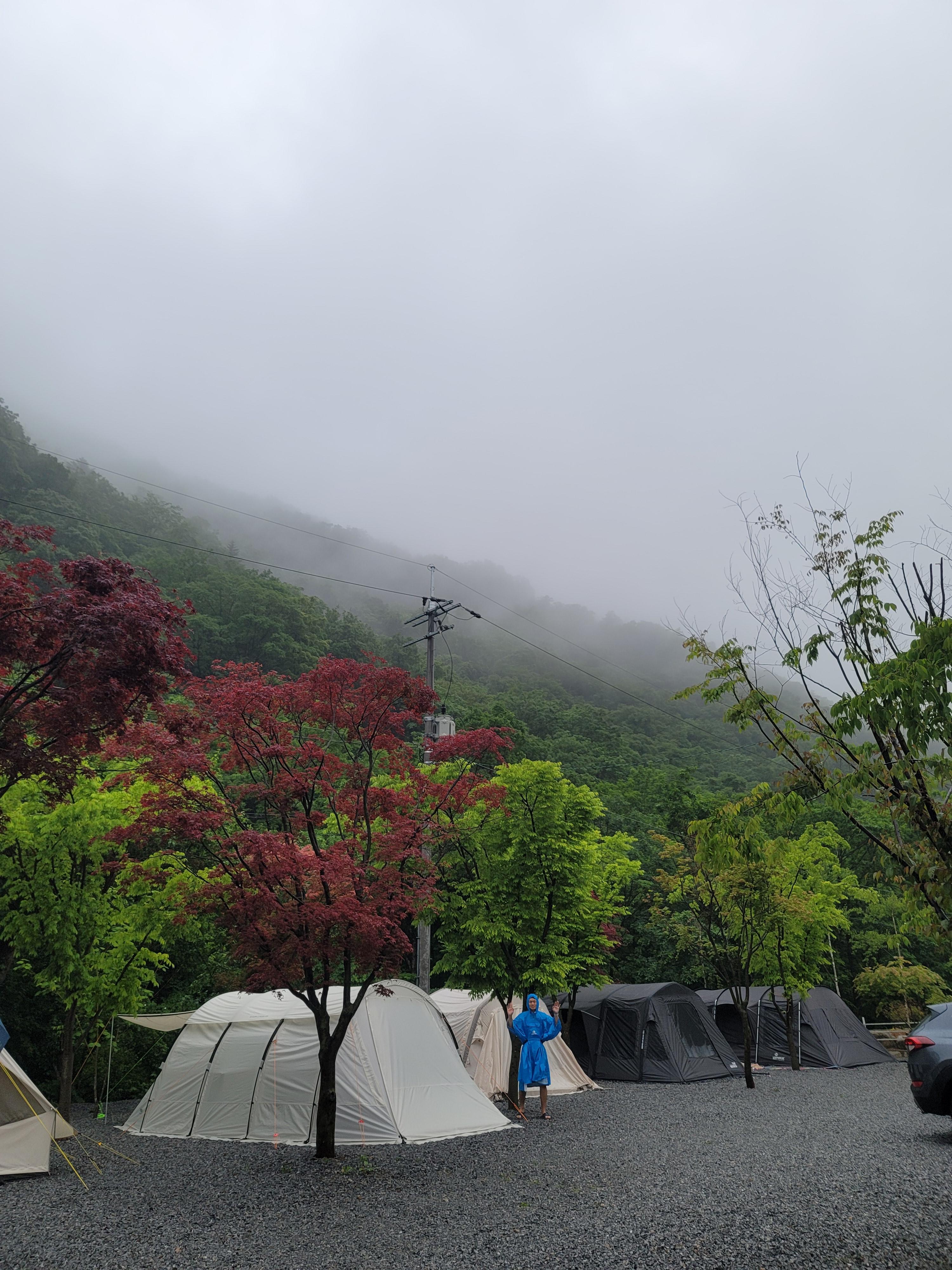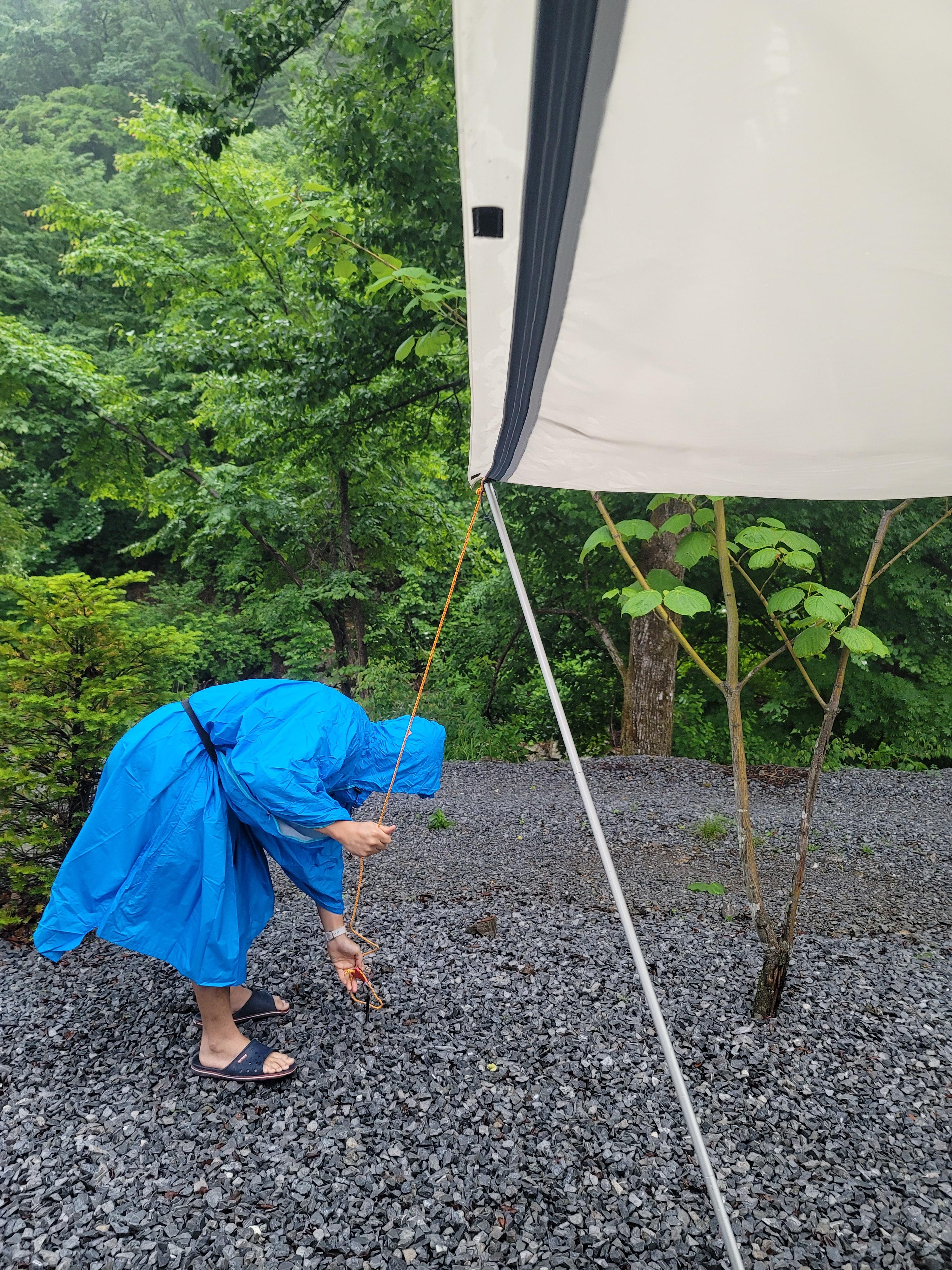 비 소식 때문에 짐을 싸서 갈지 우중캠핑을 한 번 해 볼지 고민했다. 가족회의에서 우중캠핑을 한 번 해보자고 해서 비를 맞으며 새벽부터 팩을 박아서 어닝 폴대를 세웠다.