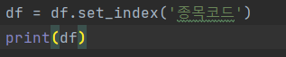 df.set_index('종목코드') 함수를 사용해서 이미 만든 'df'를 재설정 해 줍니다.