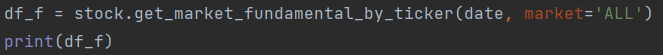 "stock.get_merket_fundamental_by_ticker'라는 함수를 사용하면 'PER'을 가져올 수 있습니다. 여기에도 날짜가 인자로 들어가기에 맨 처음 날짜를 변수로 빼버린 것입니다. 프린트를 해서 결과를 확인해 보도록 하겠습니다.