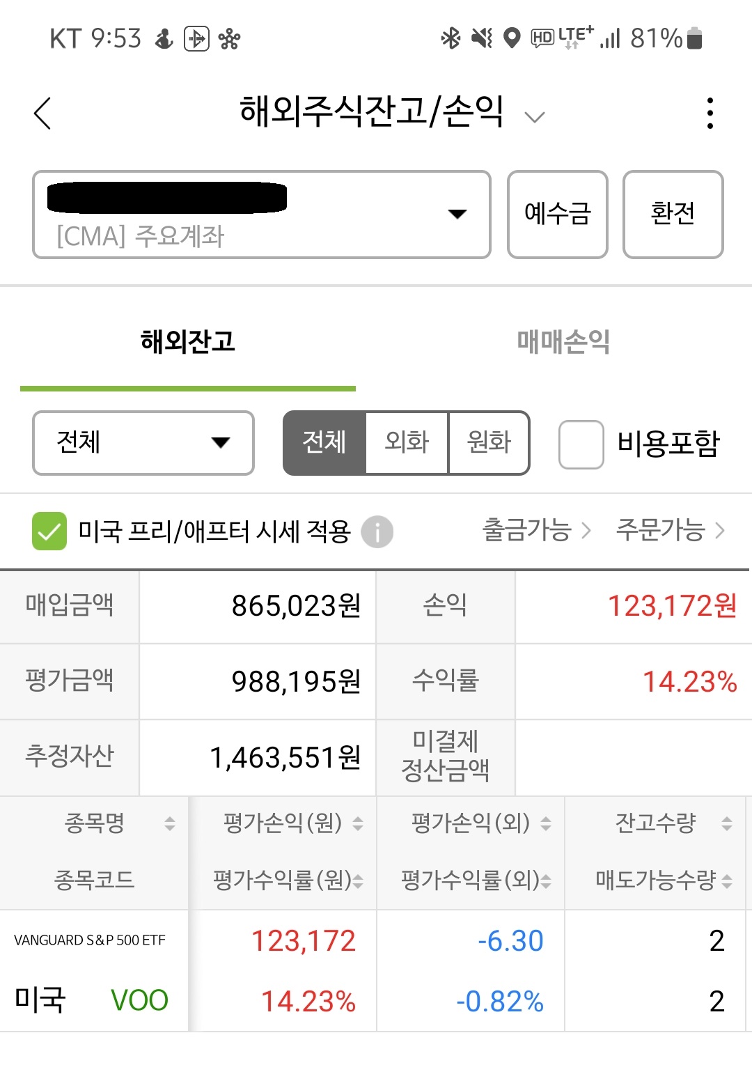 하지만 재미있게도 환율을 고려한 평가 손익은 14% 이익으로 표시되고 있습니다. 최근 환율이 높아서 비록 시장이 좋지 않음에도 불구하고 수익을 볼 수 있는 것입니다.