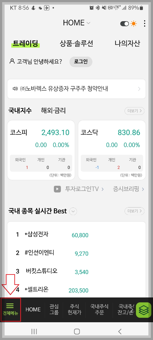 NH투자증권의 앱인 "나무" 첫 화면에서 왼쪽 아래에 "전체메뉴"를 눌러줍니다.