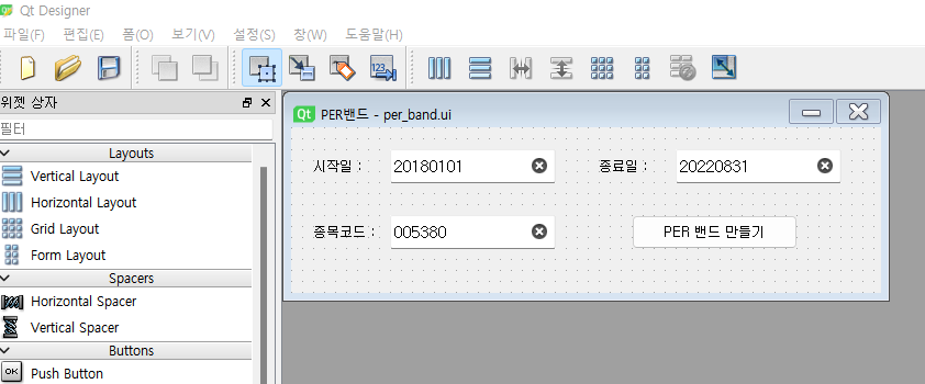 Qt Desinger에서 UI 폼은 이렇게 만들었습니다.