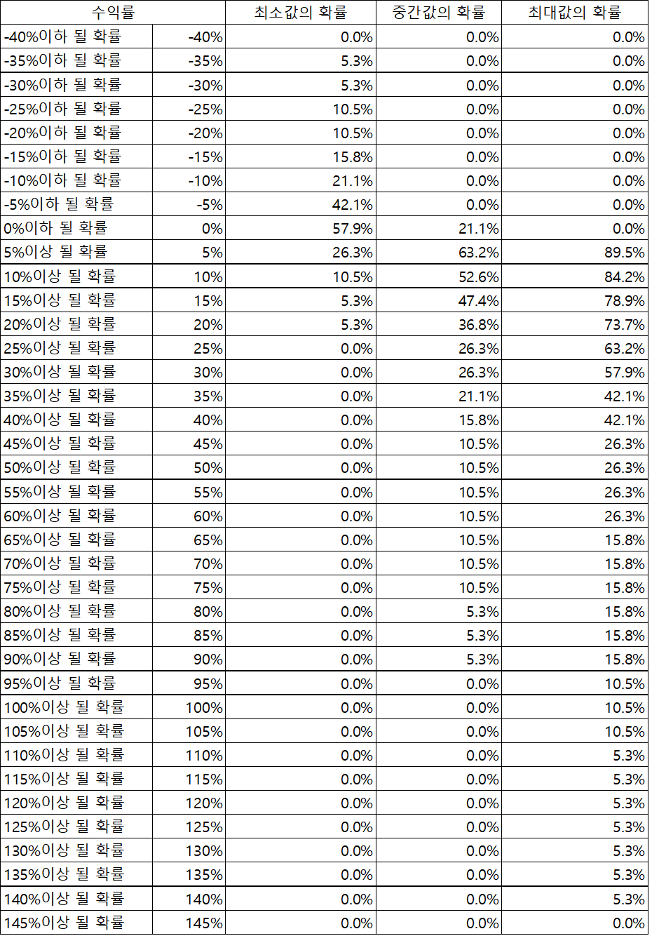 10% 이상 수익은 84% 확률이다. 최대값 기준이지만, 10% 이상 되었을때 판다고 가정하면 10번 중 8번은 가능 하다는 것이다. 그럼 이제 고민할 부분은 투자를 하고 나서 10% 수익에 달성하지 못 했을때 어떻게 해야 하는지이다. 1년동안 기다렸지만 10% 수익은 달성하지 못하고 결국 손실로 매도할 경우도 있다. 그러면 나 스스로 5% 정도 되었을때 팔걸 하는 아쉬움이 클 것이다.