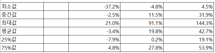 년도별로 최소, 중간, 최대수익률을 구해봤다.