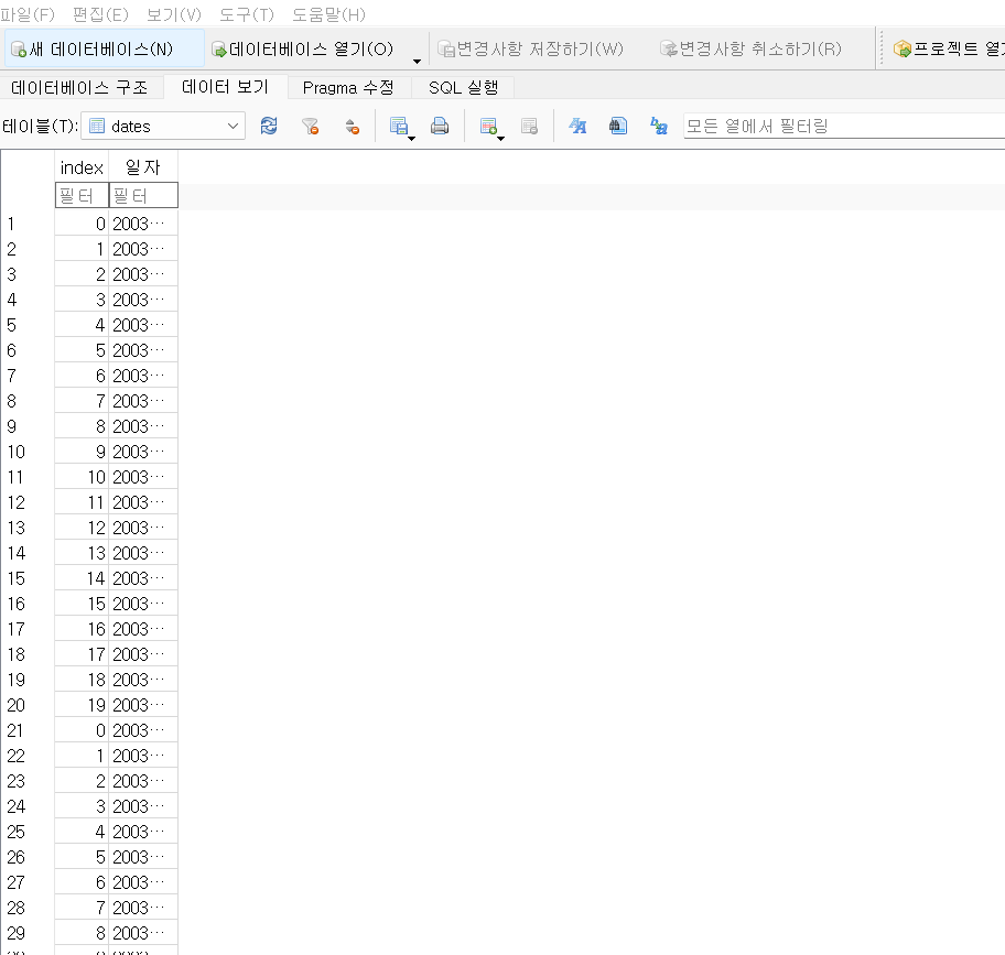 차단이 되면 다시 돌려서 차단 된 이전 시점까지 날짜 범위를 바꿔서 다시 돌린다음 그 데이터를 DB에 저장했다. 그리고 그 다음 날짜부터 또 다시 돌렸다. 기간을 쪼개서 돌리다 보니 2003년 부터 2022년 8월 31일까지 날짜 데이터를 받는데 이틀이 걸렸다.