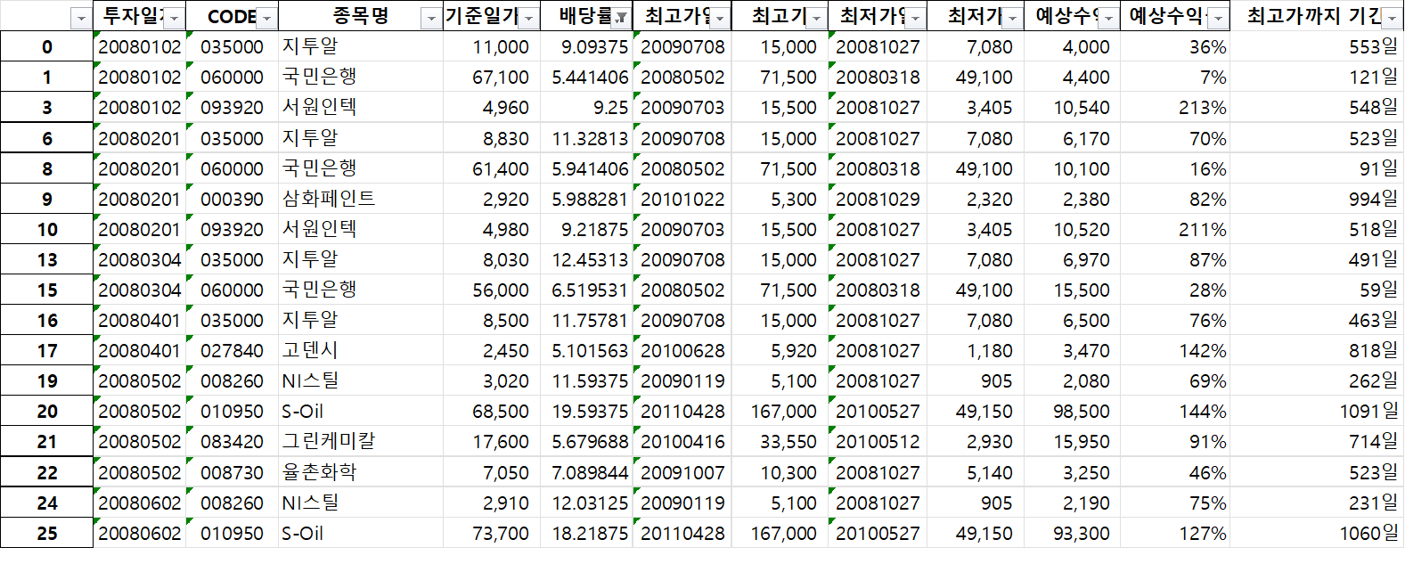 total_df = pd.DataFrame(data=total_li, columns=['투자일자', 'CODE', '종목명', '최고가일', '최고가', '최저가일', '최저가', '기준일가격', '배당률'])