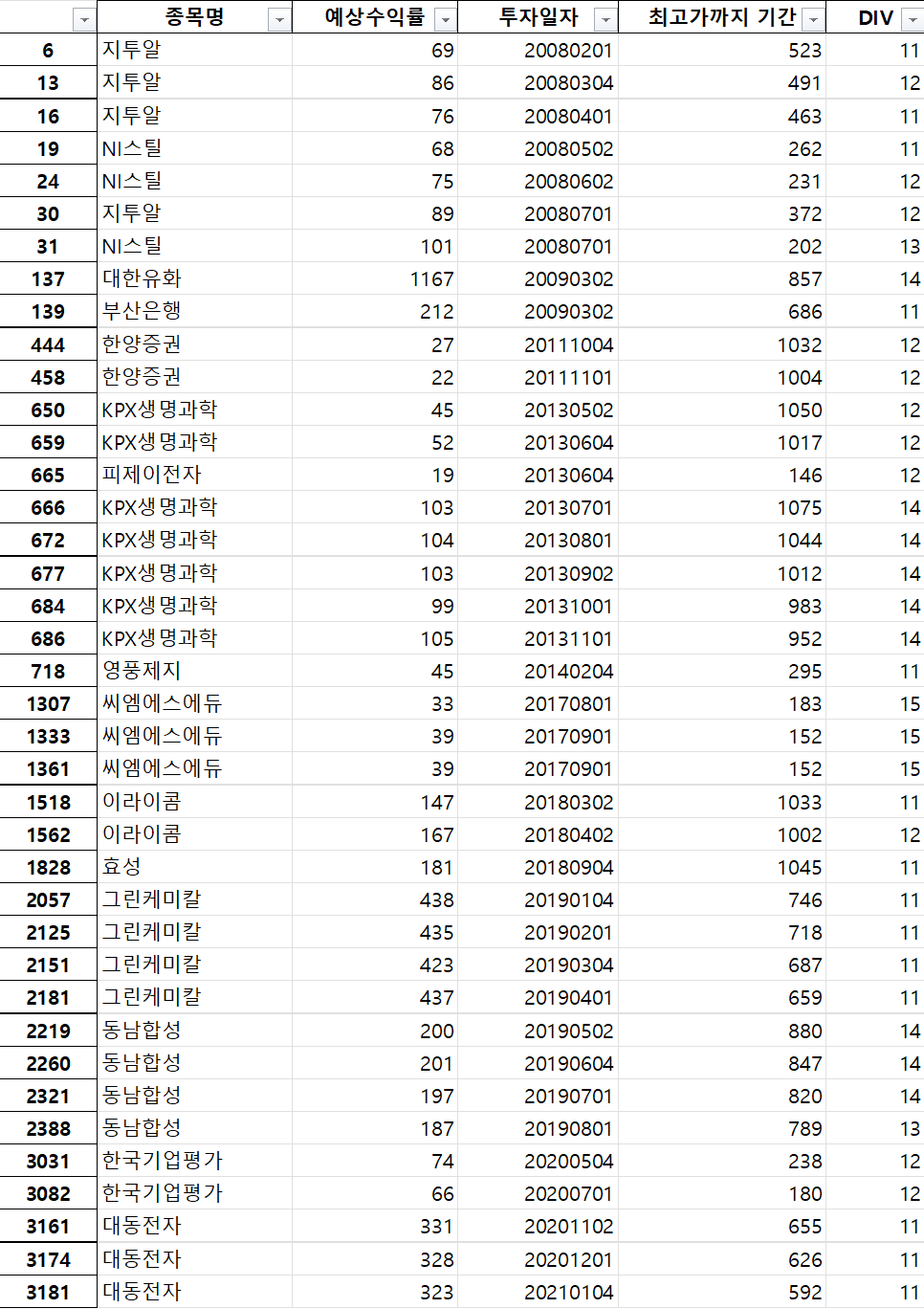 df = pd.read_excel('배당수익률을 이용한 백테스트(DIV3이상,5년내90%이상,3년수익예상).xlsx')