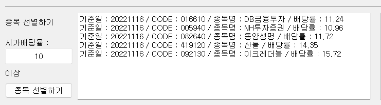 그 밑에는 배당률을 기준으로 종목을 1차 선별할 수 있도록 하였다.