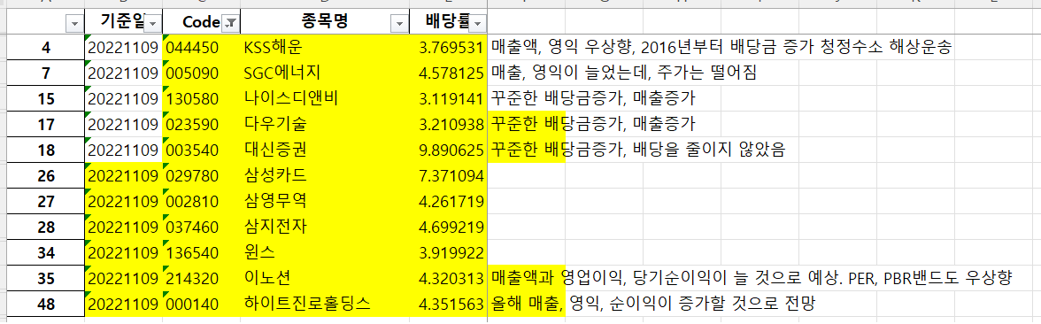 영업흐름이 최근에 마이너스를 기록한 기업 또한 제외하였고, 배당성향이 높은 기업도 제외하였습니다. 배당성향이 높은 기업은 주주친화적이라고 생각할 수 있지만, 혹시나 기업이 어려워져서 이익이 줄어들면 배당을 줄일 확률이 크기 때문입니다.