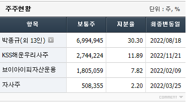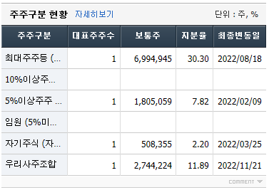 최대주주 및 우리사주까지 합해도 50%가 되지 않네요. 원래 책에는 최대주주 지분율이 높은 주식을 사라고 했지만, 이 회사에 대해 찾아볼 수록 마음에 들어서 매수를 했습니다.