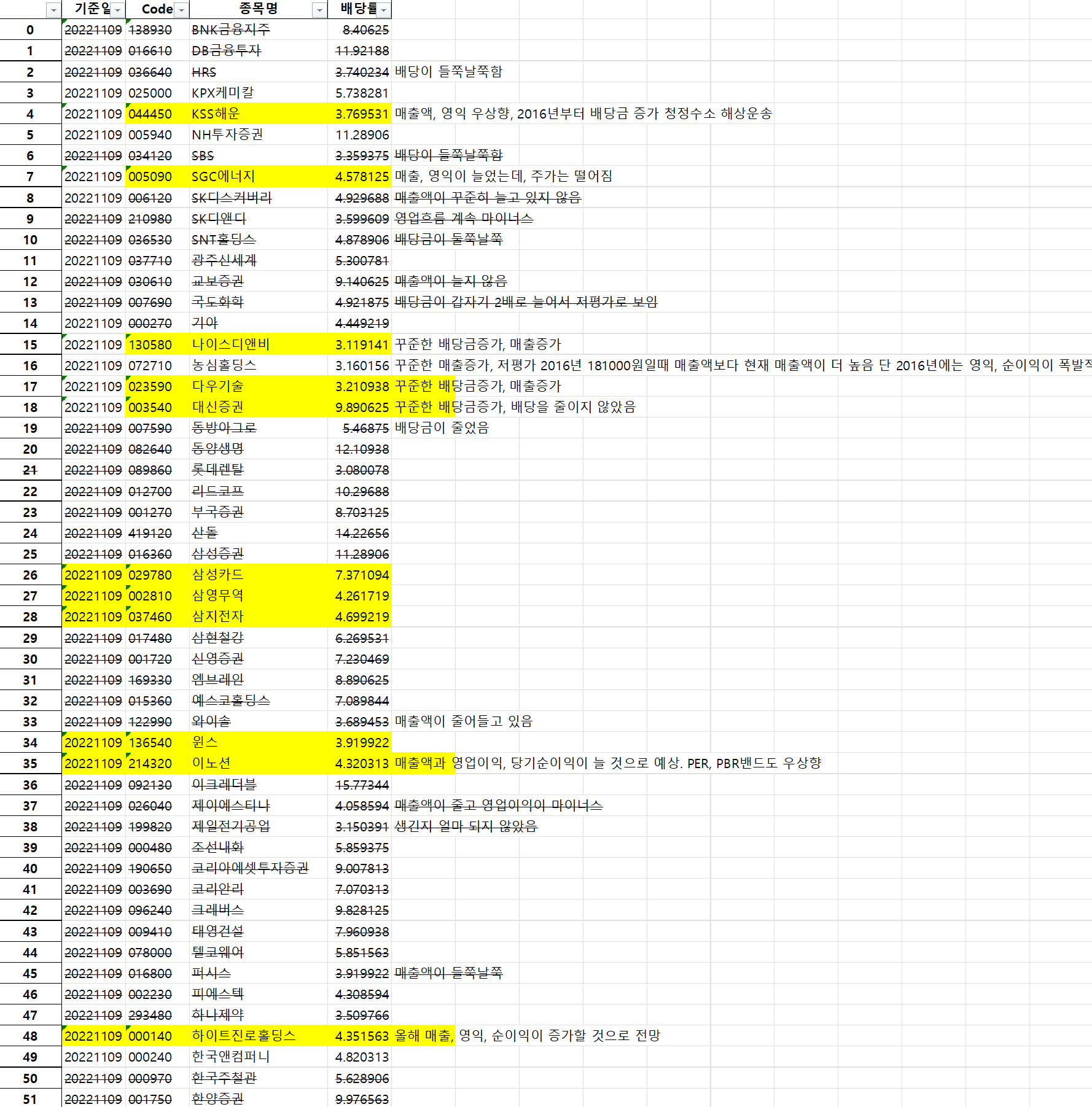 배당률을 3 이상으로 하니깐 52개의 종목이 나오네요. 아마도 시장이 많이 하락해 있어서 많이 나오는 것 같습니다.