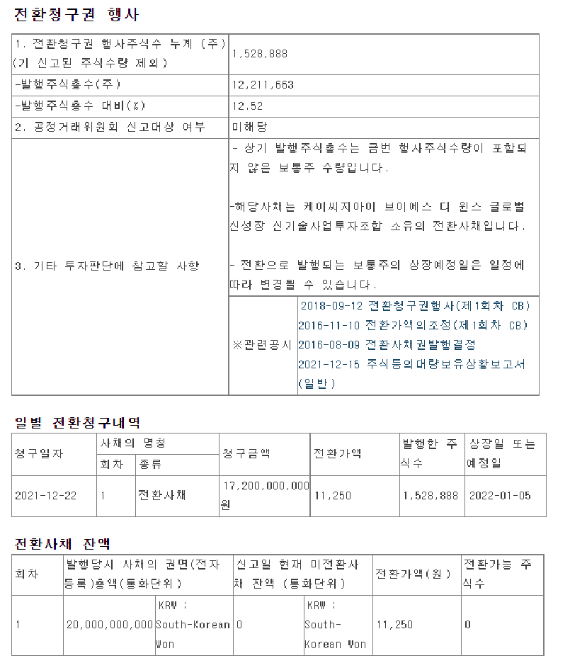 전환사채를 발행한 적이 있었네요. 이런... 그래도 다행히 오버행 이슈는 없어진거네요. 11,250원으로 전환해서 지금 13,000원이니깐 대략 15%정도 수익이 달성되었네요. 주가가 20,000원을 넘긴적도 있었는데 이정도가 저가라고 판단한 걸까요? 아니면 앞으로 주가가 많이 오를거라 판단을 했을까요? 내부 사정을 도통 모르니...