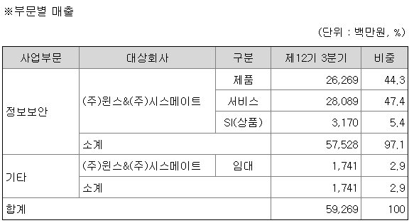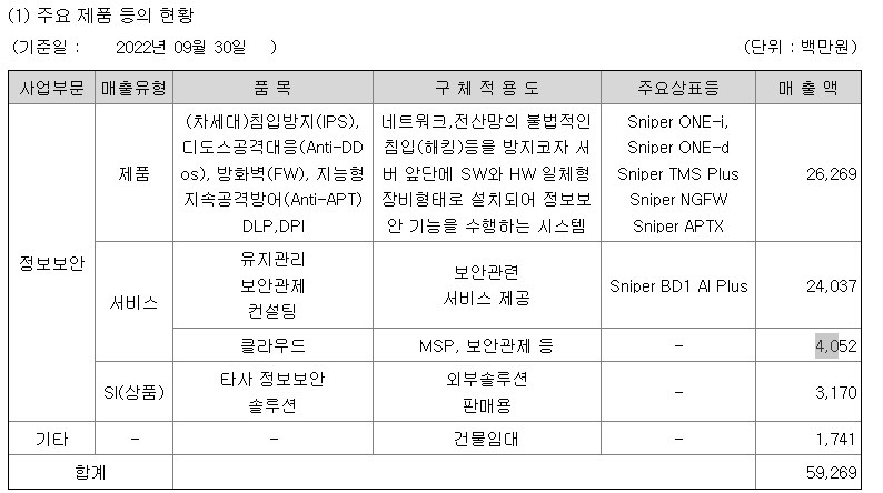 부분별 매출은 위와 같습니다. 정보보안과 관련된 사업을 하는 업체네요.