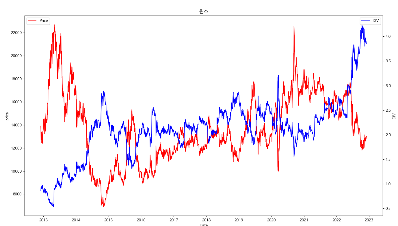 이렇게 그래프가 나오면 이 종목이 좋다는 뜻은 아닙니다. 다만, 이렇게 주가와 DIV가 반대로 움직이는 주식은 미래 배당률을 예측하기가 수월합니다.