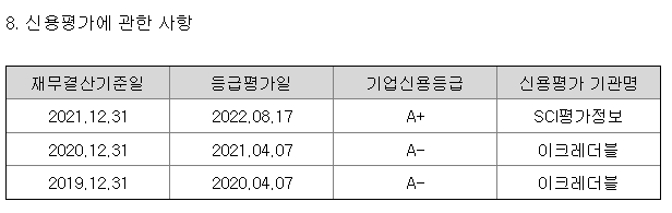 신용평가 등급이 괜찮네요. (아쉬운 점은 나이스디앤비 여기서 신용평가를 받았으면 좋았겠다는 개인적인 의견이 있습니다. 제가 나이스디앤비 주주라.... 헛소리 했습니다.)