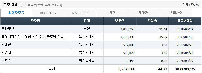 다시 주주상세 내용을 보겠습니다. 금양통신 지분이 21.64%이고, KCGI가 15% 지분을 확보해서 경영권을 행사할 수 있는 2대 주주에 올랐습니다. 그리고 자기주식을 9.5% 샀습니다. 이거 재밌네요. 조만간 이 기업 경영권 싸움이 일어날 수도 있겠네요.