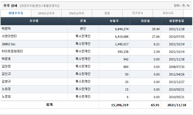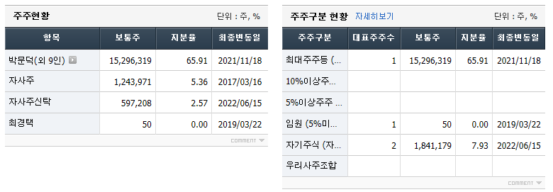 최대주주가 66%정도되네요. 상당히 지분율이 높습니다. 지주회사라 그렇겠죠? 박문덕이라는 분은 배당만 해도 어마무시하게 돈을 받으시겠네요. 부럽네요.