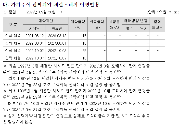 주가안정을 위해 자사주를 매입을 하려고 자사주 신탁을 맺었는데 그걸 연장한다는 얘기입니다. 근데 제가 알지 못하는 무신 내막이 있는건 아닐까요? 자사주를 매입한다는건 좋은데 계약연장만 하고 매입을 안 할 수도 있겠네요...