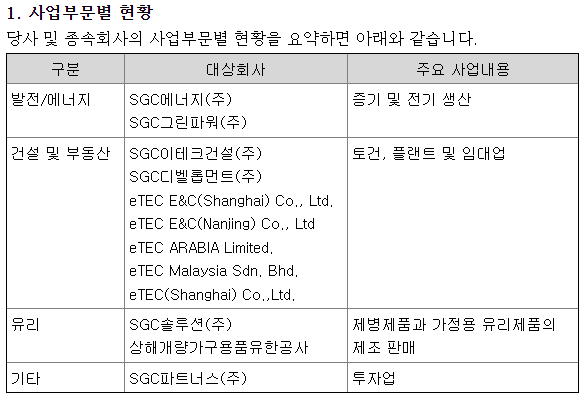 2020년 10월에 합병 및 분할을 해서 사명이 SGC로 변경되었습니다. 삼광글라스가 군장에너지를 흡수합병하고 물적분할을 통해 유리사업부분은 SGC솔루션으로 신규 설립하였고, 이테크건설에서 인적분할한 투자부문을 흡수합병하여 SGC에너지로 변경하였습니다. 결국 발전소와 투자사업을 SGC에너지에서 한다는 말이군요.